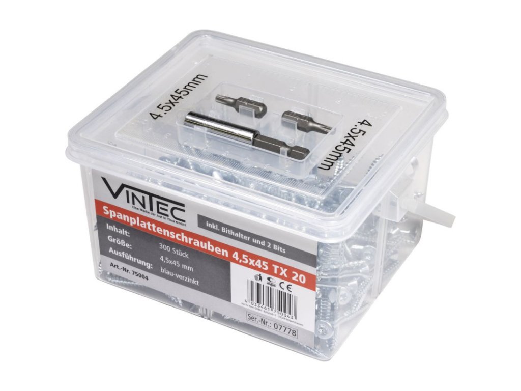Skrutky do drevotriesky so zápustnou hlavou. V praktickom boxe, vrátane 2 bitov a držiaka bitu. V balení 300 ks. Skrutky do drevotriesky so zápustnou hlavou. V praktickom boxe, vrátane 2 bitov a držiaka bitu. V balení 300 ks.Materiál: oceľ